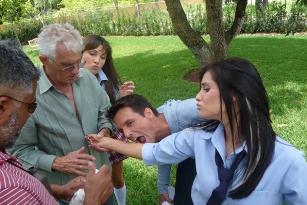 Algo que muchos no saben es que mientras grabamos ocurren muchas anecdotas. Aqui les dejo una de ellas mientras grababamos “Pecadora”. Me tocaba trepar un muro para ir a ver a mi novio en la escena. Todo iba bien hasta que tuve que saltar hacia el otro lado. Me fui de cara y me raspe el brazo con unas plantas!! Nada grave, pero al final se cambio la escena y termino siendo Marie Anne Lovera quien saltara el muro. Gajes del oficio jeje 😉